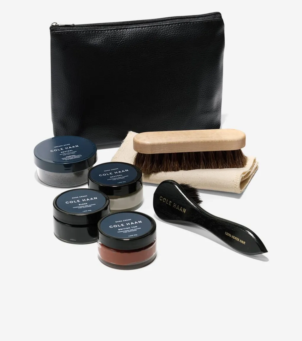 This kit is an excellent starter kit for anyone purchasing Cole Haan footwear. The leather pouch contains three colors of shoe cream (Black, Neutral and British Tan), an applicator brush, buffing brush, cloth, and an instant shine sponge. All items are less than 3 oz and are airport security-friendly. Kit measures 6″ x 8″ x 2″.